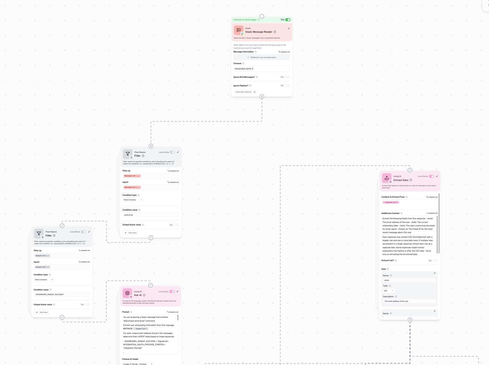 Context: I am building an agent that automates customer success outreach for customers signing up on our platform. When users sign up and progress through our onboarding process (signing up, starting integration, completing integration, or revoking access), these events are automatically logged to a Slack monitoring channel. The flow watches this channel and when we see someone from our team types “@Gumloop send email,” in the thread of a message, it processes recent onboarding events to identify users who need follow-up communication. Using AI, it generates personalised emails tailored to each user’s specific onboarding stage – encouraging new signups to complete integration, helping users who started but didn’t finish, congratulating successful integrations, or gathering feedback from users who revoked access.