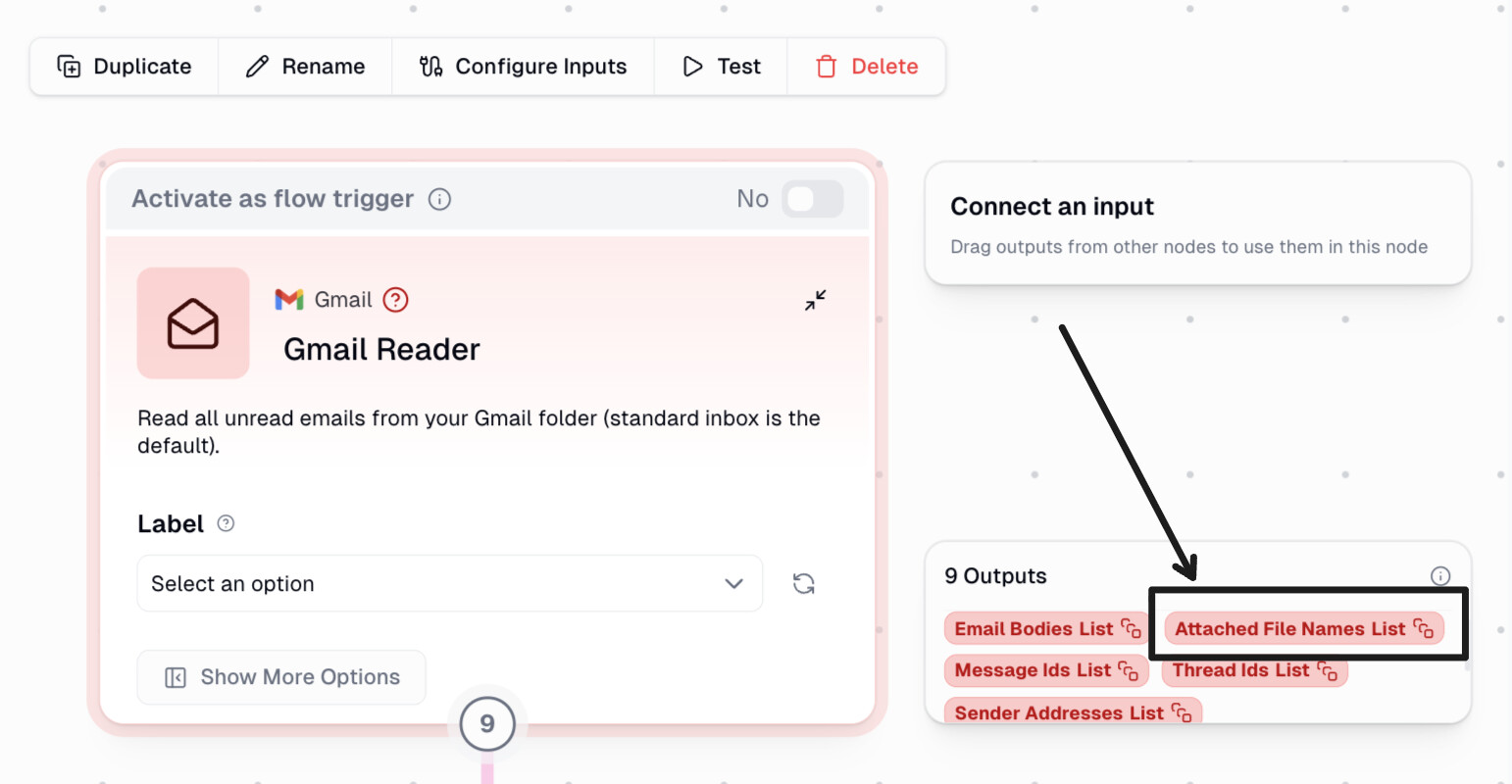 So instead of passing a link, you can directly pass the “Attached File Names” output badge from the Gmail Reader node into your next step (e.g., the PDF Reader or custom node). This ensures the workflow references the actual file objects.